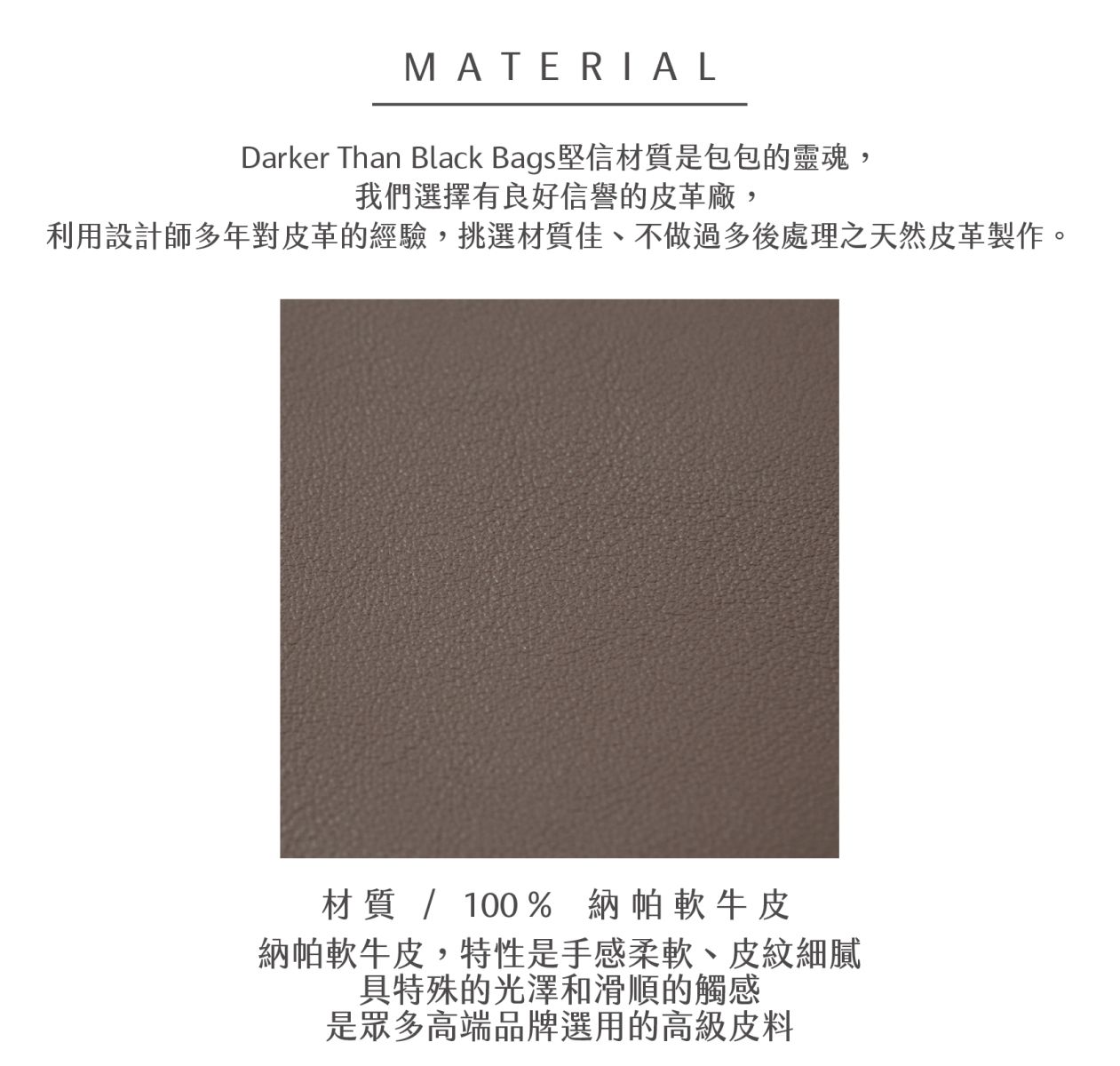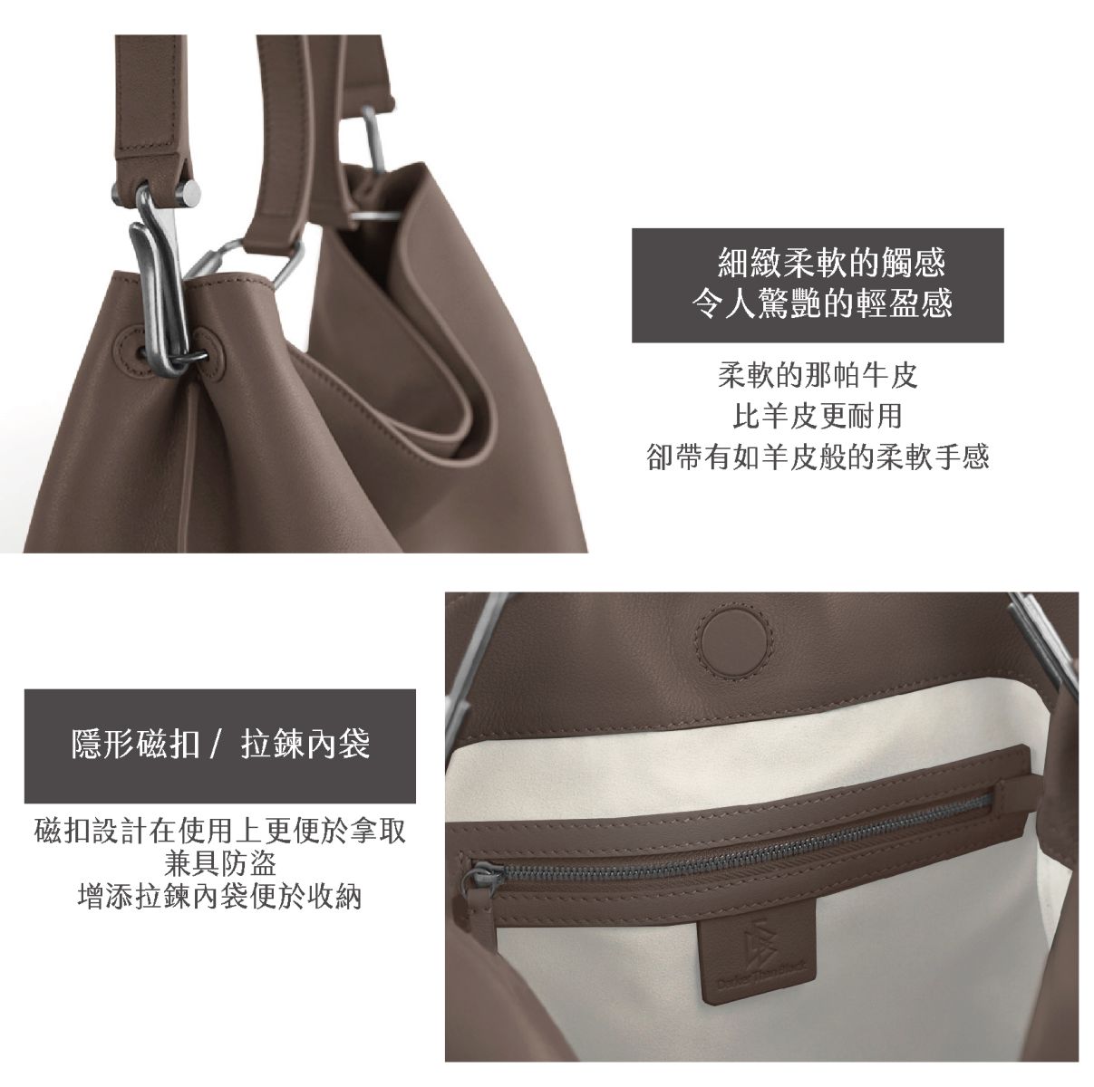 選用柔軟納帕牛皮,皮紋細膩、手感滑順。