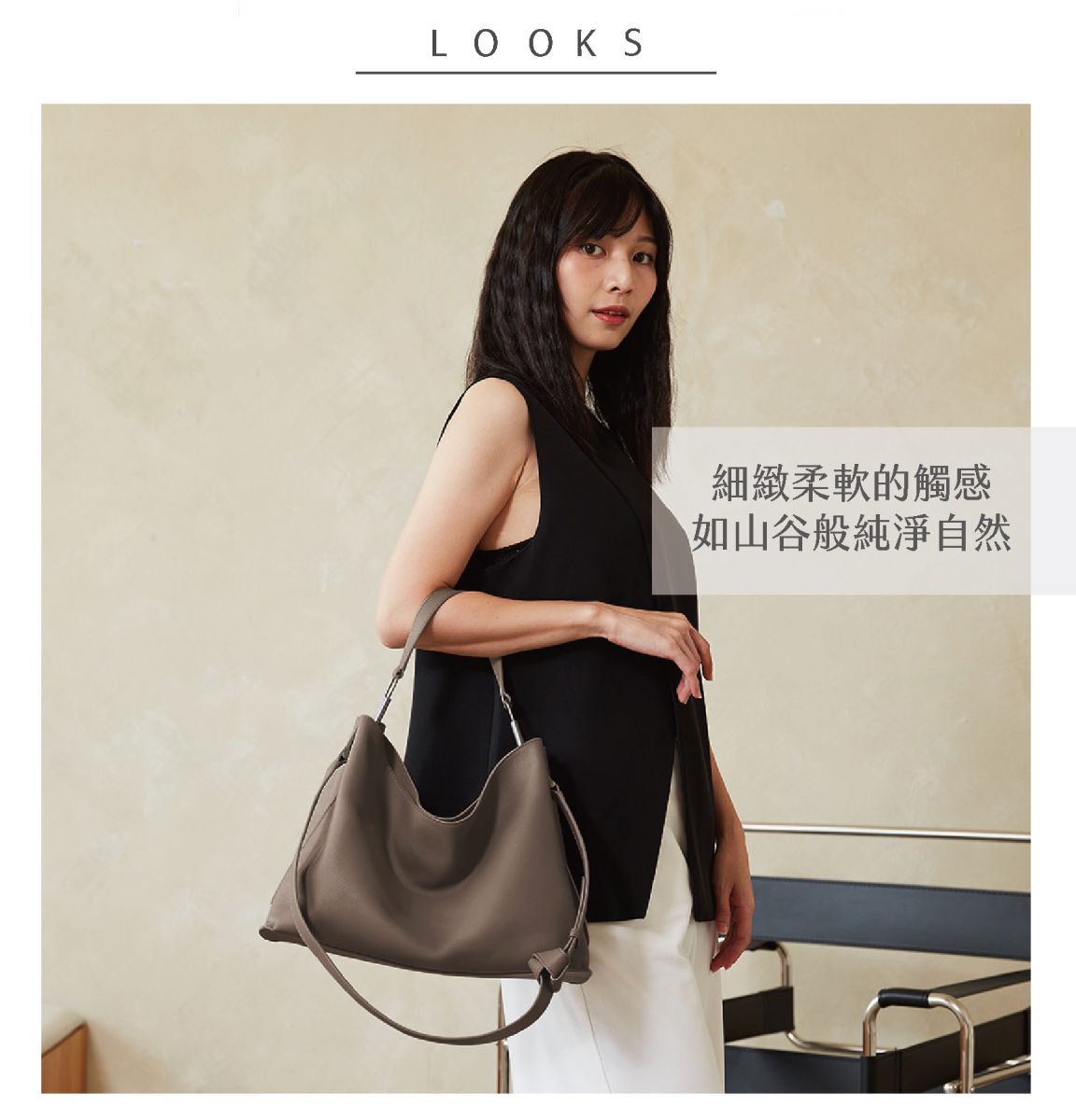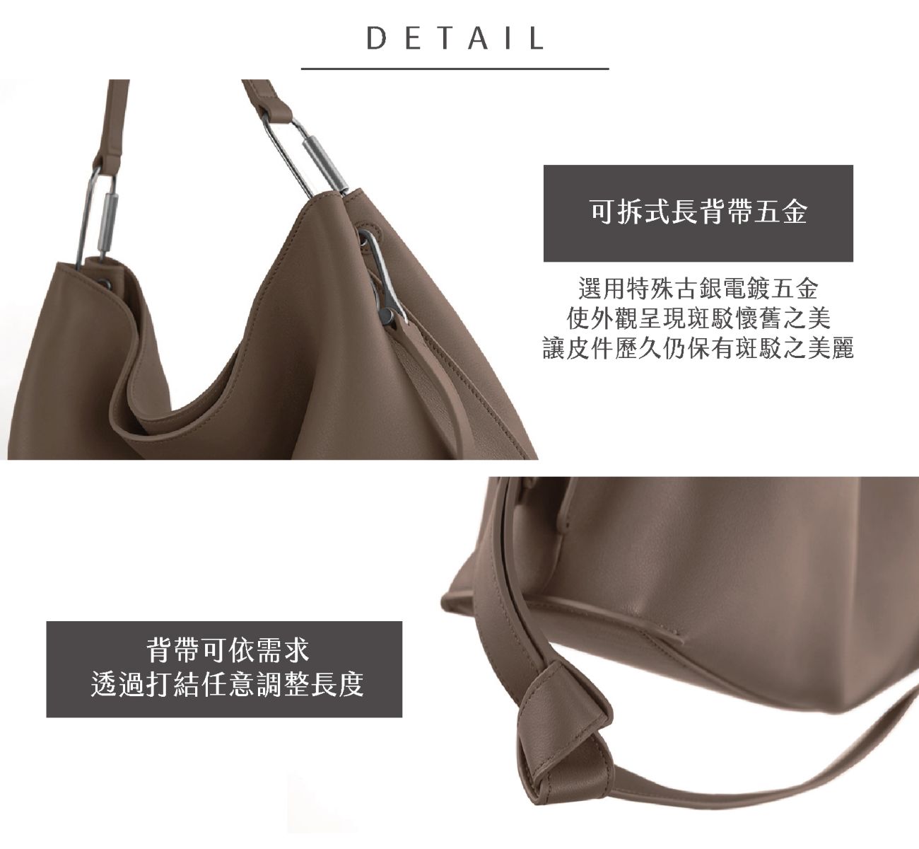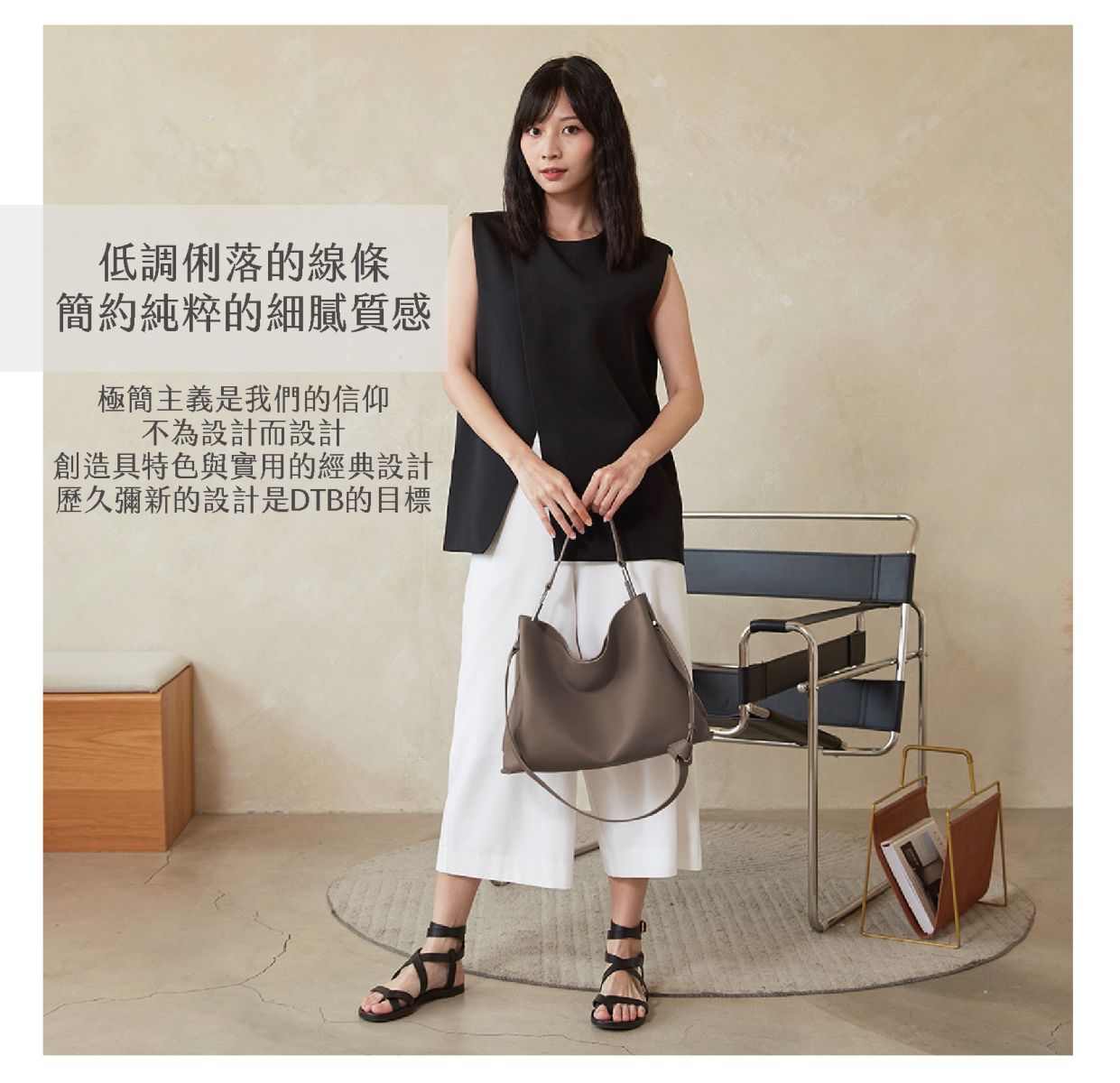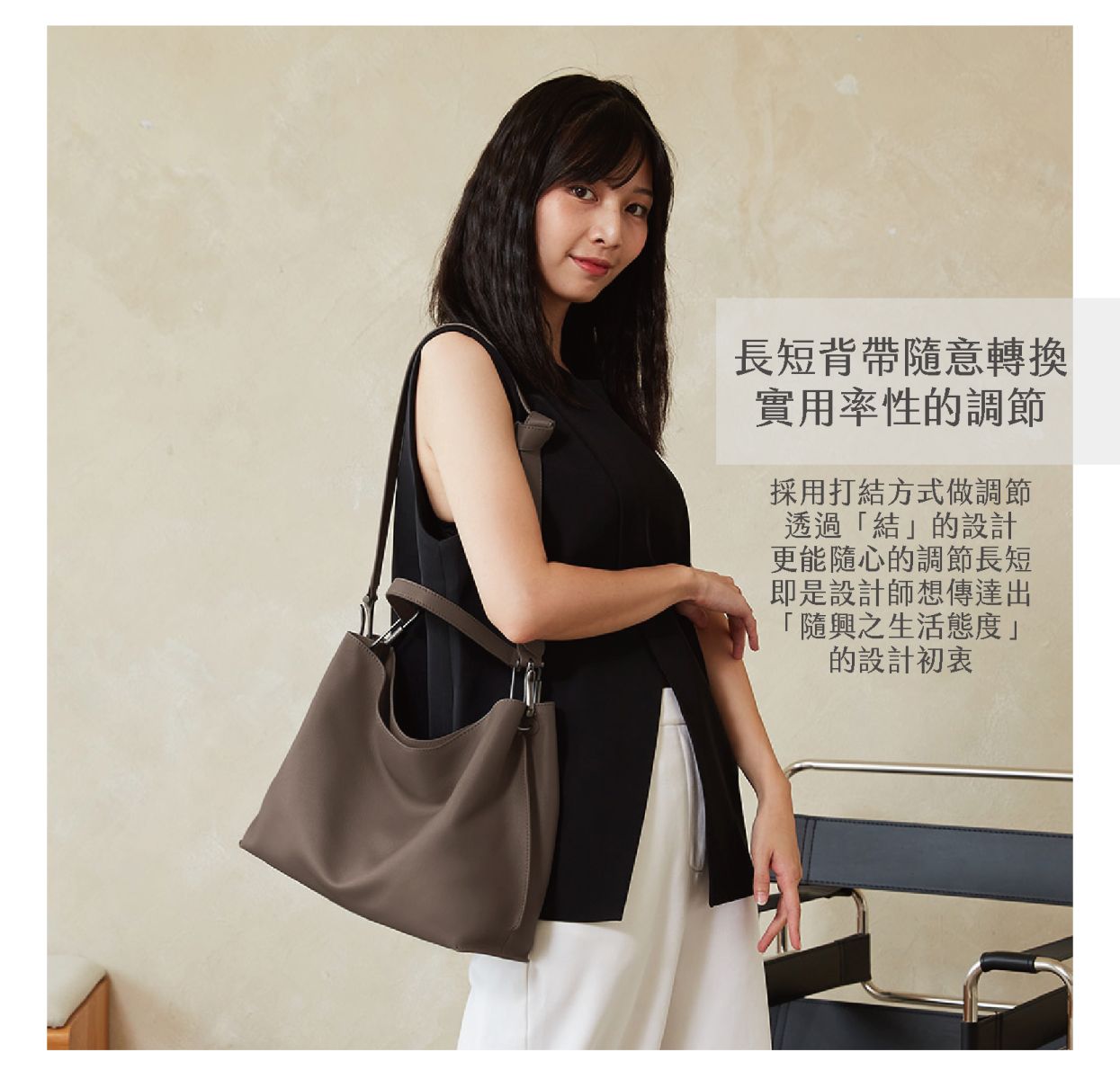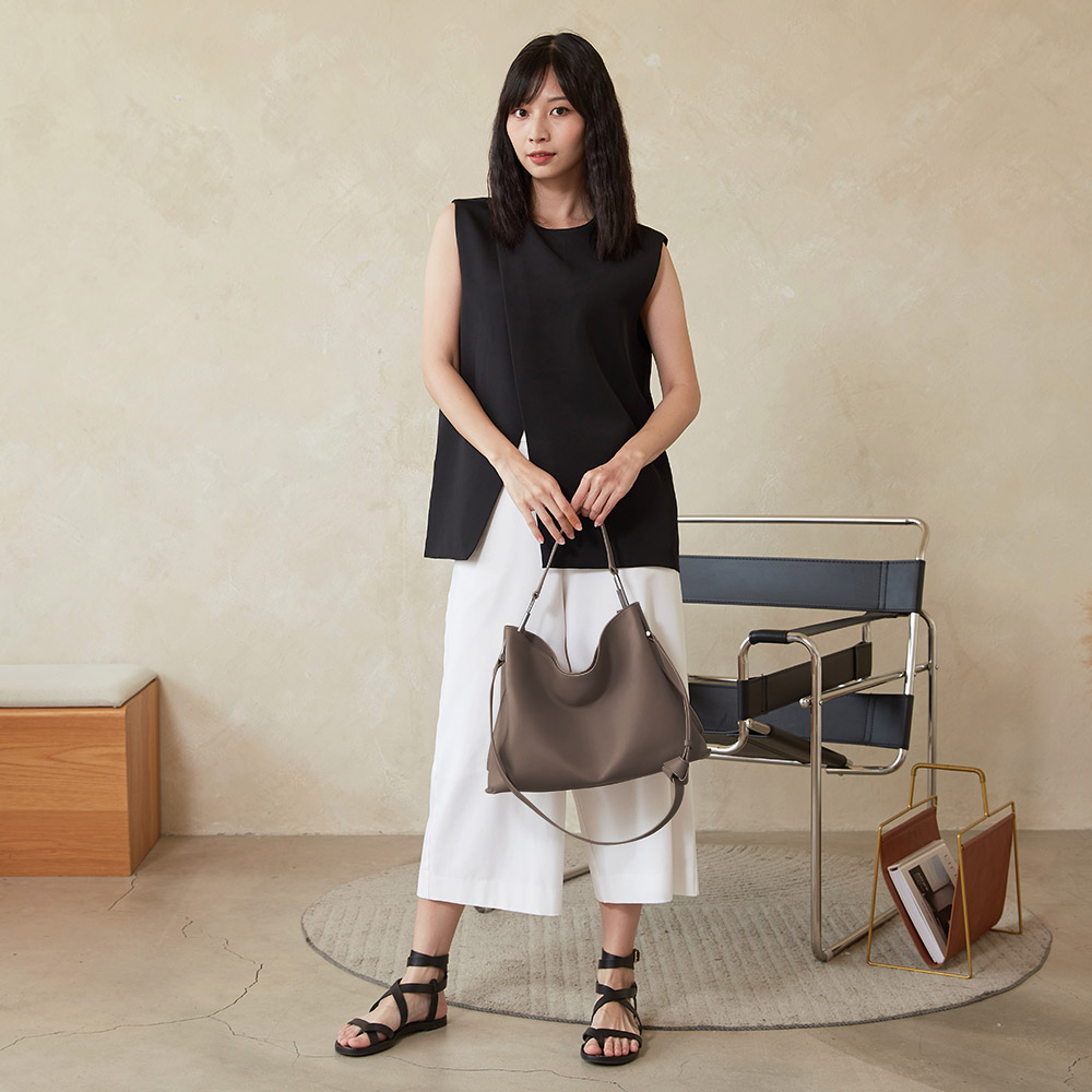 獨特的扭結背帶設計,簡約俐落。